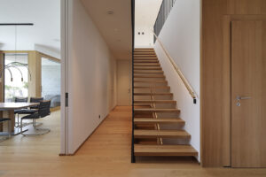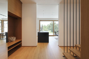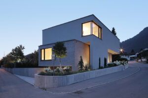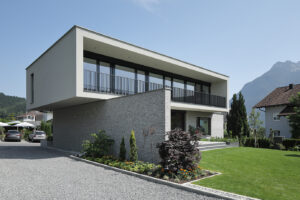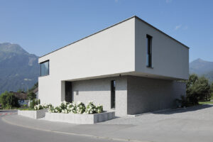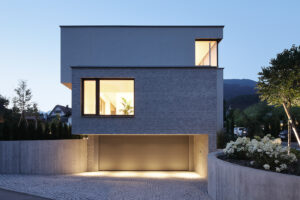 Vor traumhafter Bergkulisse haben WOM Architektur und Bau GmbH dieses Haus realisiert. Ein Spiel aus Kuben, Scheiben, Vor- und Rücksprüngen zeichnet dieses Gebäude das sich Eleganz auf dem Hanggrundstück platziert aus. Geschwungene Sichtbetonmauern führen zur intelligent platzierten Garage. Im Innenraum wird die hohe Qualität der Ausführung fortgesetzt.